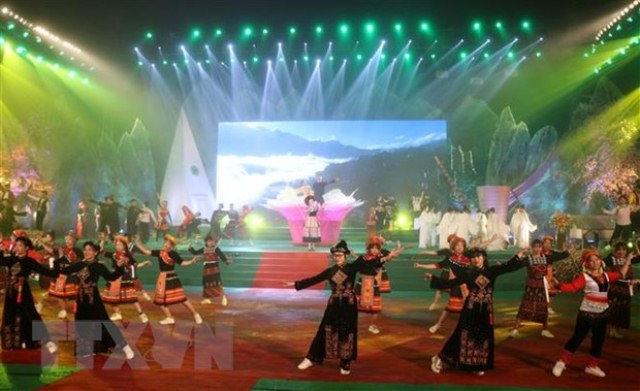 Biểu diễn văn nghệ chào mừng tại buổi lễ. (Ảnh: Quốc Khánh/TTXVN)