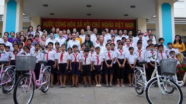 Phó Thủ tướng Thường trực Chính phủ Trương Hòa Bình trao tặng xe đạp cho học sinh có hoàn cảnh khó khăn, người dân tộc Khmer. Ảnh: VGP/Mạnh Hùng