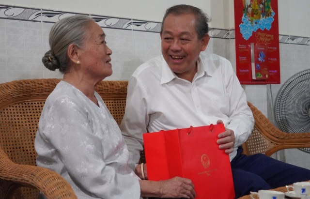 Phó Thủ tướng Thường trực Chính phủ Trương Hòa Bình thăm bà Nguyễn Ngọc Trinh, người hoạt động kháng chiến bị bắt tù đày. Ảnh: VGP/Mạnh Hùng