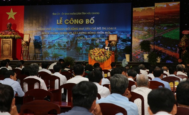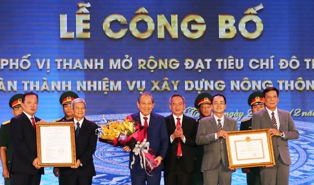 Ủy viên Bộ Chính trị, Phó Thủ tướng Thường trực Chính phủ Trương Hòa Bình tham dự và trao bằng công nhận đô thị loại II và hoàn thành nhiệm vụ xây dựng NTM cho lãnh đạo thành phố Vị Thanh.