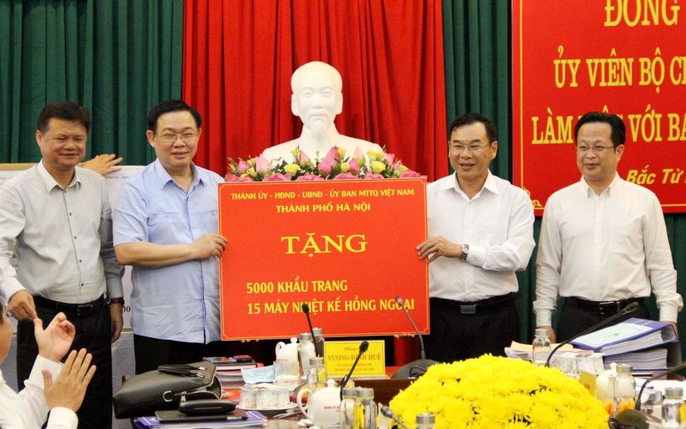 Bí thư Thành ủy Hà Nội tặng quận Bắc Từ Liêm 5.000 khẩu trang và 15 nhiệt kế hồng ngoại để phục vụ công tác chống dịch.