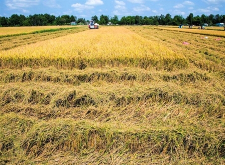 Nông dân xã Tân Lộc (huyện Thới Bình) dùng máy gặt đặt liên hợp thu hoạch lúa...