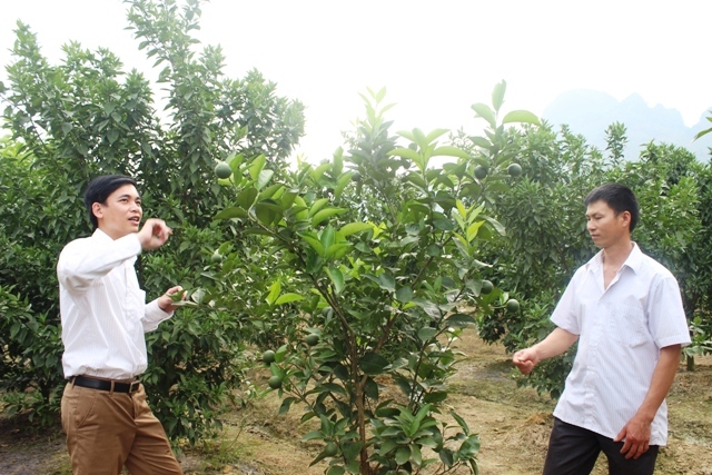 Ông Lành Văn Lôi (bên phải ảnh) cùng cán bộ Ban điều phối NTM của tỉnh Lạng Sơn trao đổi về mô hình chuyển đổi trên vườn bưởi, cam của gia đình tại xã Chi Lăng, huỵên Chi Lăng. (Ảnh: HNV).