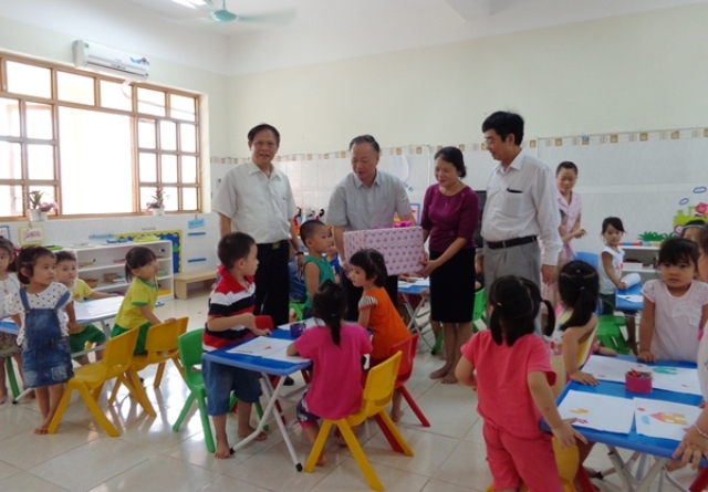 Phó Chủ tịch UBND TP Nguyễn Văn Sửu tặng quà cho các em nhỏ Trường mầm non Yên Sở