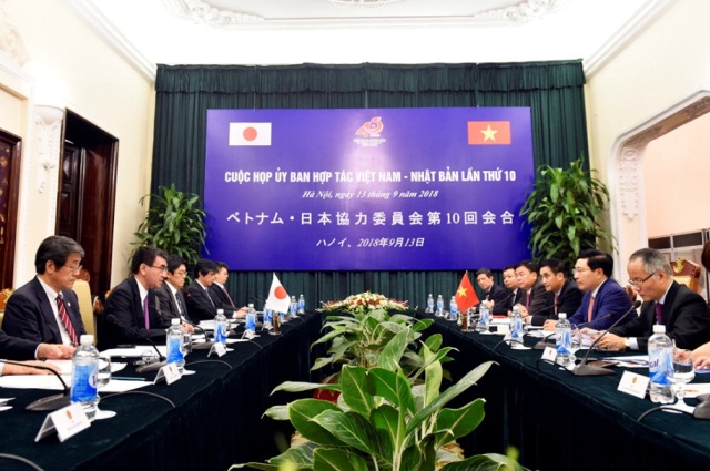 Phó Thủ tướng Phạm Bình Minh và Bộ trưởng Taro Kono bày tỏ vui mừng trước sự phát triển mạnh mẽ, toàn diện và thực chất của quan hệ Đối tác chiến lược sâu rộng Việt Nam-Nhật Bản kể từ phiên họp Ủy ban Hợp tác lần thứ 9 vào năm 2017 với sự tin cậy chính trị ngày càng được củng cố thông qua các chuyến thăm và tiếp xúc giữa lãnh đạo cấp cao hai nước.