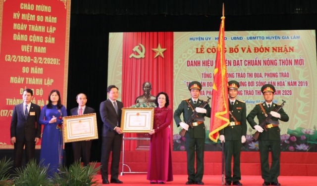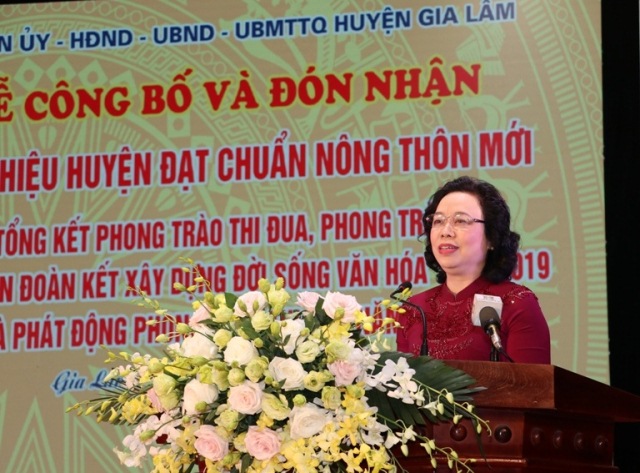 Phát biểu tại buổi lễ, Phó Bí thư Thường trực Thành ủy Ngô Thị Thanh Hằng biểu dương những thành tích xuất sắc của huyện Gia Lâm. Đồng chí nhấn mạnh: “Đón nhận bằng đạt chuẩn NTM và Huân chương Lao động của Chủ tịch nước là vinh dự, là niềm tự hào nhưng cũng là trách nhiệm to lớn của Đảng bộ, chính quyền và nhân dân huyện Gia Lâm”. Trong thời gian tới, Phó Bí thư Thường trực Thành ủy Ngô Thị Thanh Hằng đề nghị đảng bộ, chính quyền và nhân dân Huyện thực hiện toàn diện các nhiệm vụ đã đề ra; đồng thời, quan tâm thực hiện tốt việc chú trọng phát huy truyền thống đoàn kết, chủ động, sáng tạo của cả hệ thống chính trị từ Huyện đến cơ sở và các tầng lớp nhân dân, tạo sự đồng thuận cao của toàn xã hội. Đồng thời, duy trì và nâng cao chất lượng các tiêu chí xây dựng NTM theo hướng xây dựng NTM nâng cao, NTM kiểu mẫu, gắn với thực hiện các tiêu chí xây dựng xã thành phường, huyện thành quận; phấn đấu huyện Gia Lâm đủ điều kiện thành Quận vào năm 2022.