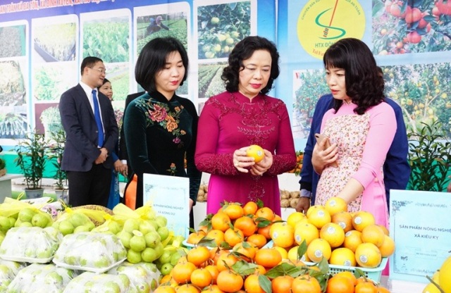 Phó Bí thư Thường trực Thành ủy Ngô Thị Thanh Hằng thăm quan các gian trưng bày sản phẩm tiêu biểu của huyện