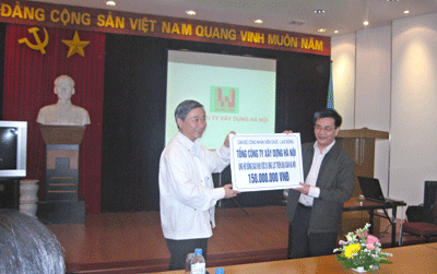 Chủ tịch HDQT Nguyễn Thanh Minh trao tiền ủng hộ đồng bào bị bão lụt trong trận mưa vừa qua cho UBND TP Hà Nội.