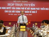 Buổi giao ban trực tuyến có sự tham gia của lãnh đạo các Cục, Vụ, Viện, các Tổng công ty lớn của Bộ Xây dựng, các ngân hàng và 5 tỉnh thành: Hà Nội, TP.HCM, Vĩnh Phúc, Đồng Nai và Bình Dương. Đây là 5 tỉnh thành có nhiều cơ sở đào tạo, nhiều KCN tập trung, nhiều đối tượng khó khăn về nhà ở. Ngoài ra, 5 địa phương này cũng đã có sự chuẩn bị tốt nhất cho chương trình phát triển nhà ở xã hội.
