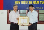Đồng chí Nguyễn Hồng Khải, Phó Bí thư Thường trực Đảng ủy Bộ Xây dựng trao Huy hiệu 30 năm tuổi Đảng cho đồng chí Nguyễn Gia Chính (trái).
