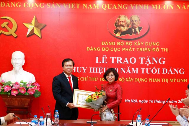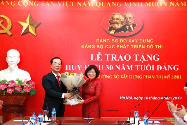 Bí thư Đảng ủy Bộ Xây dựng, Thứ trưởng Lê Quang Hùng trao Huy hiệu 30 năm tuổi Đảng cho đồng chí Phan Thị Mỹ Linh
